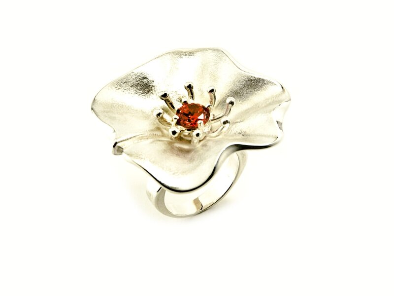 Al centro del fiore è stata incastonata a mano un cubic zirconia orange red del diametro di 6mm.