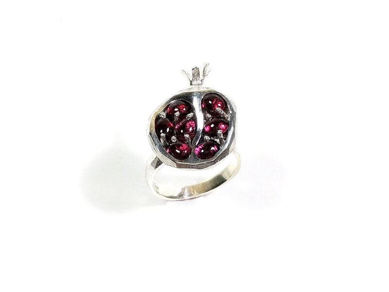 Anello microscultura in argento 925 sterling che ha la forma di un melograno.
