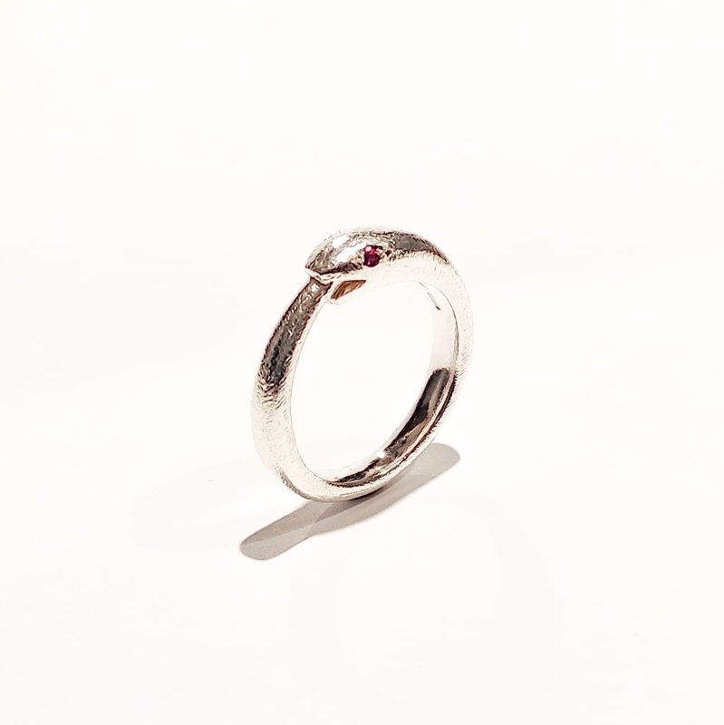 Anello a forma di serpante che morde la coda, realizzata in argento 925 e con incastonati dei rubini naturali.